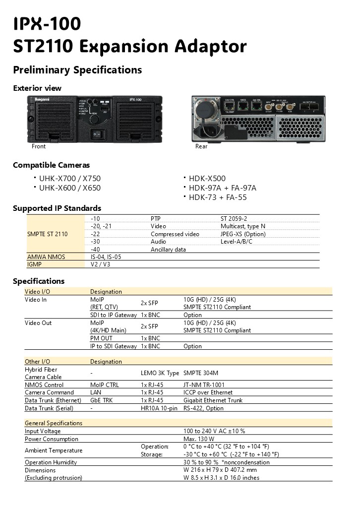 The IPX-100 is a compact and attractively priced bridge between conventional broadcast and the wider world of ST-2110 infrastructure. Compatible with all cameras in the Ikegami UNICAM-XE and UNICAM-HD series, it offers core features of our established and industry proven BSX-100 base station plus SMPTE ST 2110 Media-over-IP support. Compared to a conventional BSX-100 Base station, the new IPX-100 model is one third smaller in size at just 2U high by half 19-inch rack width. JPEG-XS encoding (ST 2110-22) is available as a future software option, important to adapt the data rate to the given bandwidth of the IP infrastructure.