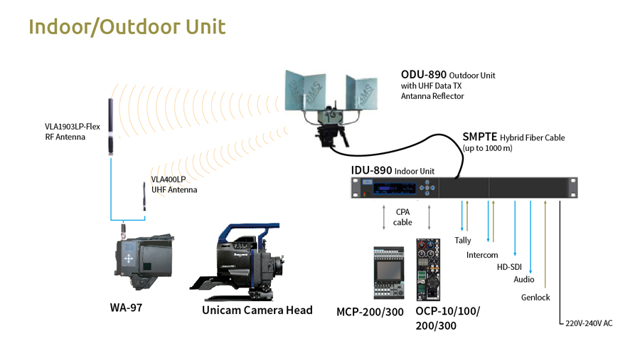 The Fibre Indoor Unit is the complementary part to the Outdoor Unit. It receives the ASI Transport Stream generated by the ODU. Besides the ASI signal, the remote control data and the power supply for the outdoor unit are also transmitted via the hybrid fiber cable. By using the inbuilt display and the keyboard, the frequency of the ODU can be directly set from the indoor unit.