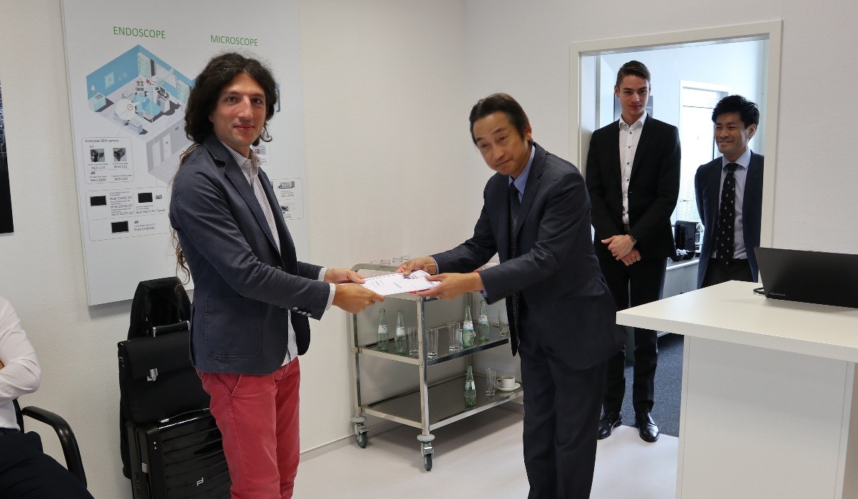 Two annual awards for Best Ikegami Medical Products Dealer were presented by Ikegami Europe President Kenzo Ishizuka. The award for fiscal year 2018 was received by Oliver Horn on behalf of Bildsysteme HORN, based in Aalen, Germany. The award for fiscal year 2019 was received by Silvio Colombaro on behalf of iARVOMED S.r.L., based in Alessandria, Italy.